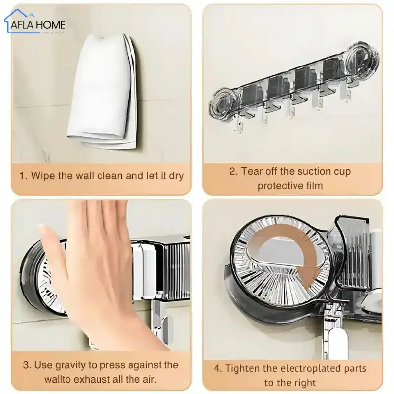 يمكنك تركيب المنتج بسهولة عبر 4 خطوات فقط: نظّف الحائط وجففه، انزع اللاصق الواقي، اضغط لتفريغ الهواء، ثم ثبّت بالدوران ليصبح جاهزاً لتعليق أدواتك